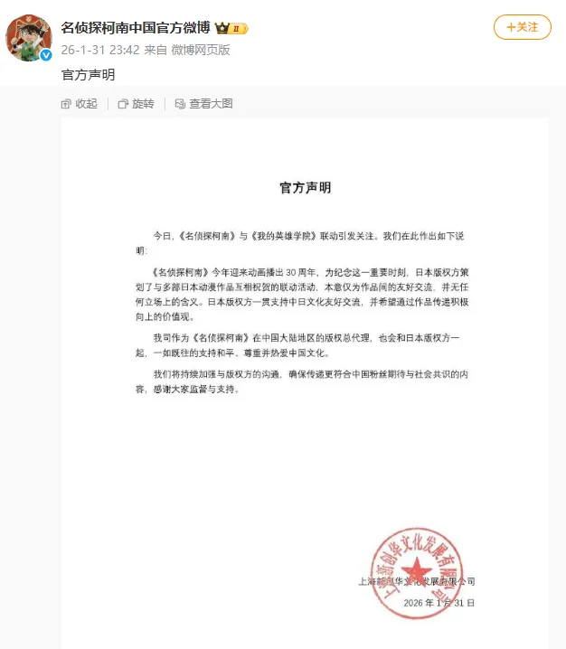 【《名侦探柯南》与辱华漫画联动,中国大陆版权代理方深夜声明】据光明日报报道,近日,《名侦探柯南》与漫画《我的英雄学院》联动,作者互相绘制对方动画角色,引发质疑。中国大陆地区版权总代理上海新创华文化发展有限公司发布官方声明。
