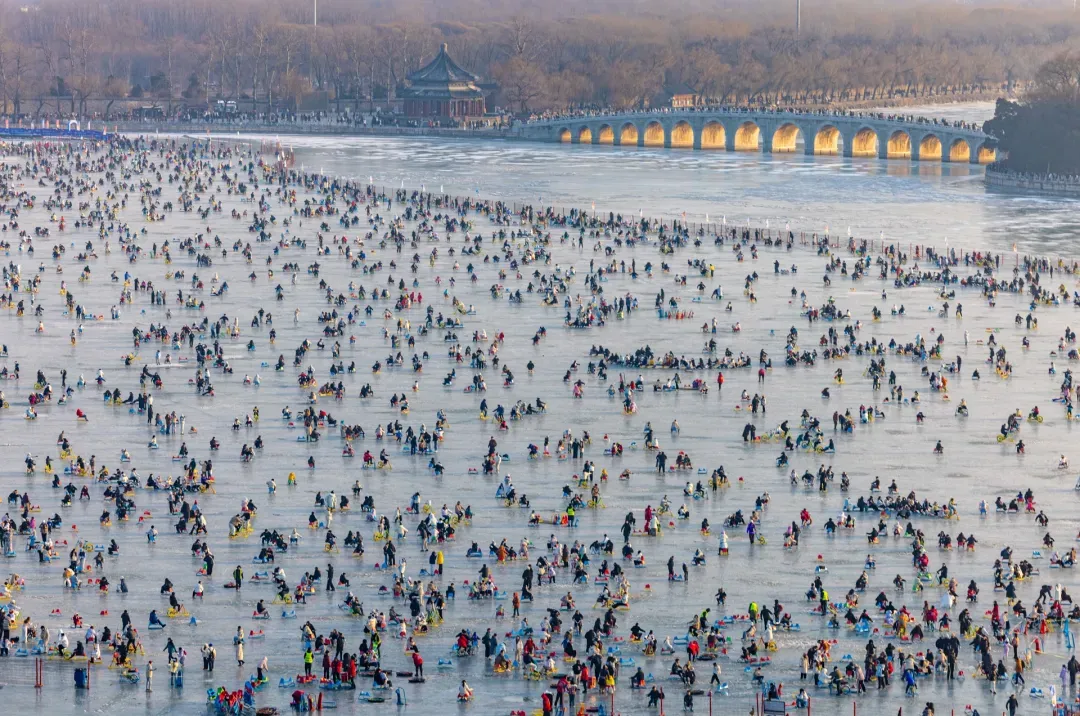 这个周末,市民游客纷纷奔赴冰场,抓住这最后的冬日限定乐趣,其中颐和园昆明湖冰场更是迎来客流高峰,上演了一场热闹非凡的“万人冰嬉”名场面。从万寿山高处望去,广阔的冰面上人头攒动、热闹非凡,色彩明快的单人冰车、双人冰车与冰上自行车往来穿梭,欢快的笑声与游客的呼喊声交织在一起,为皇家园林注入了蓬勃的冬日活力。