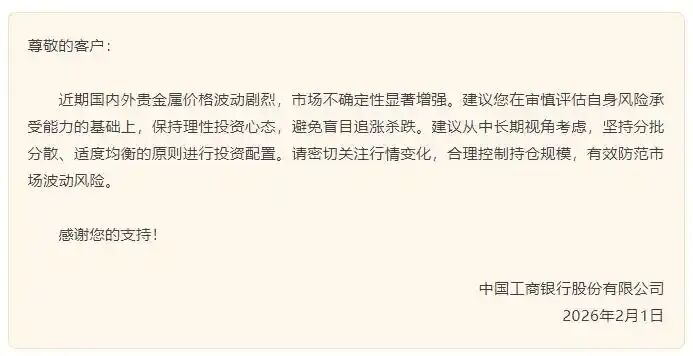 【多家银行发布风险提示】据人民日报报道,日前,随着金价大幅震荡,工行、农行、中行、建行、交行等多家银行相继调整积存金相关业务,并发布风险提示。消息称,近期国内外贵金属价格波动剧烈,市场不确定性显著增强。建议投资者在审慎评估自身风险承受能力的基础上,保持理性投资心态,避免盲目追涨杀跌。