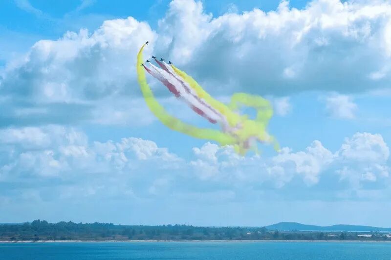 【空军八一飞行表演队歼-10战机完成检验性飞行】2月1日上午,应邀参加第十届新加坡航展的空军八一飞行表演队,在新加坡樟宜机场顺利完成检验性飞行,6架歼-10表演机率先进行六机超密集编队通场,拉出象征中新两国国旗颜色的红、黄、白三色彩烟低空掠过海面,六道彩色航迹犹如彩虹一般,勾勒出优美多姿的轨迹。