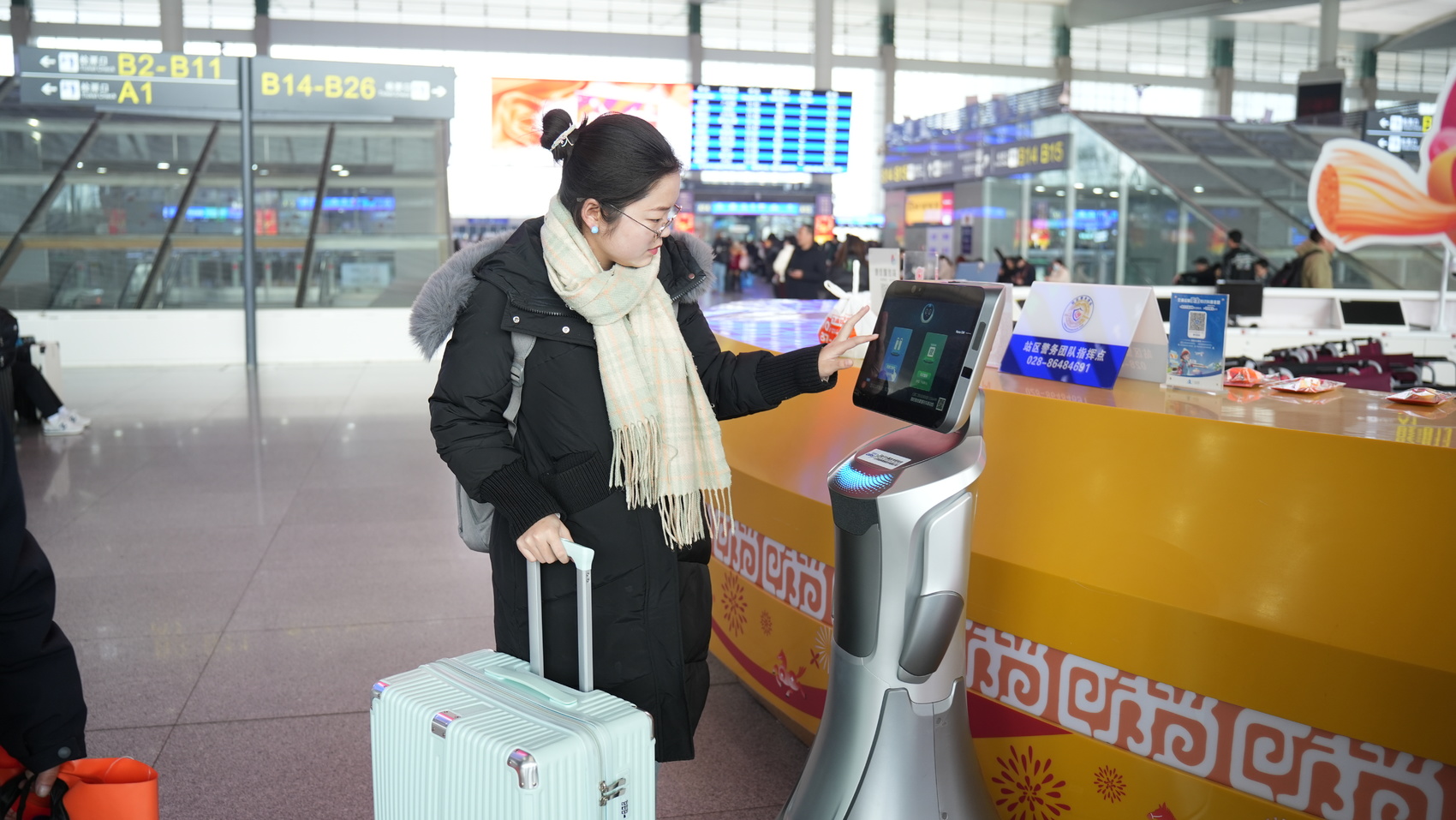 旅客与智能咨询机器人互动。