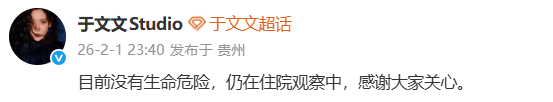 2月1日晚,于文文工作室发文回应:目前没有生命危险,仍在住院观察中,感谢大家关心。
