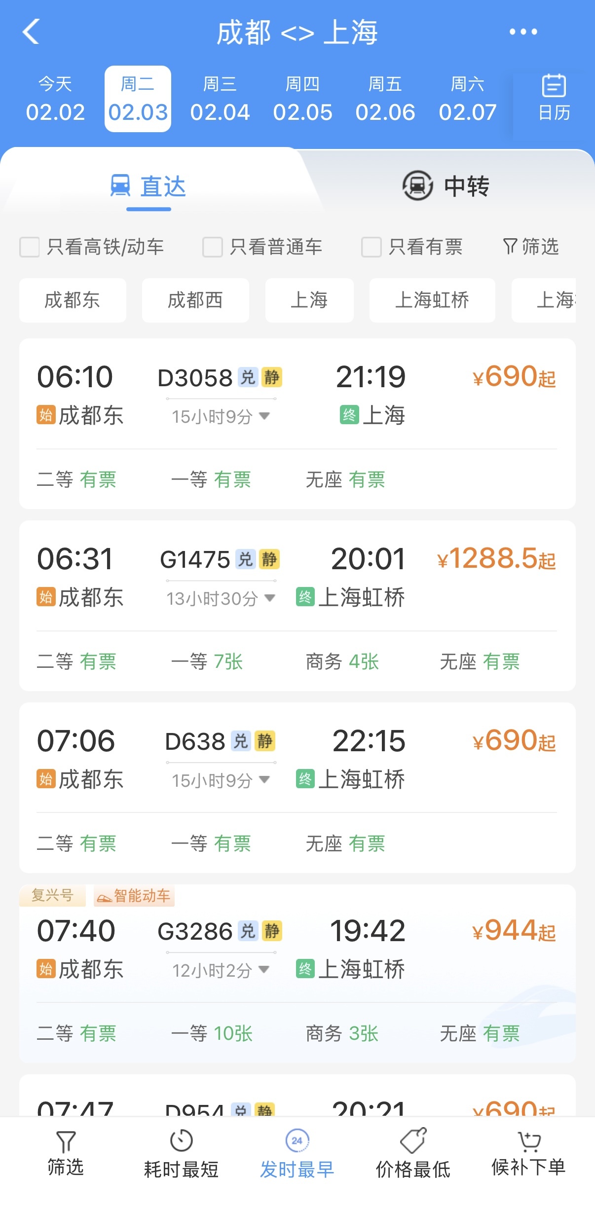 登录12306平台后,记者以成都为出发地进行了车票查询。结果显示,当前由成都开往北京、上海、广州、深圳、重庆、西安、香港西九龙等多个方向的列车,均已提供“静音车厢”服务。
