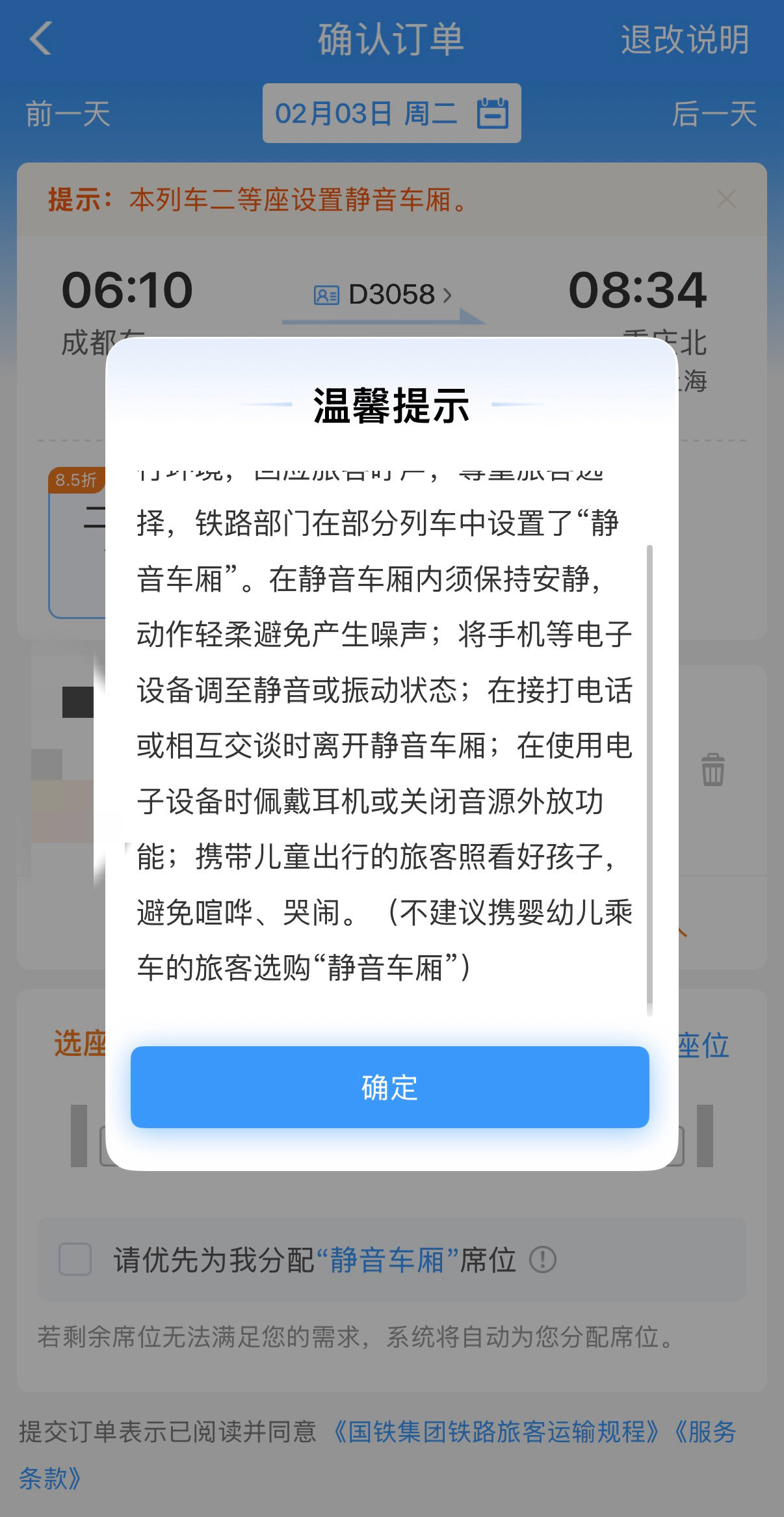 记者还留意到,在预订提供“静音车厢”服务的车票时,订单确认页面还会标注“本列车二等座设有静音车厢”等相关提示信息。与此同时,在选择座位环节,旅客还可以勾选“请优先为我分配‘静音车厢’席位”的选项,以便系统优先分配。