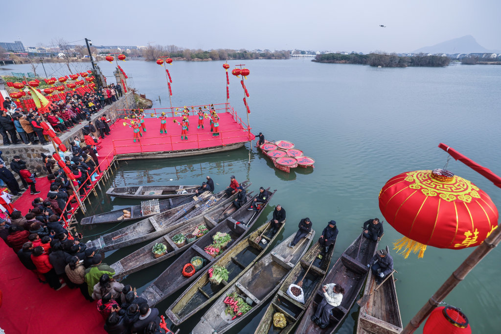临近春节,浙江省杭州市临平区塘栖镇莫家桥村举行传统民俗过大年活动,在水乡河边搭建戏台,上演舞蹈、武术、传统越剧等节目,同时在现场进行打年糕、写春联、做米塑等活动,重现了水乡古镇传统的过年民俗,为即将到来的新春佳节营造浓浓的喜庆气氛。