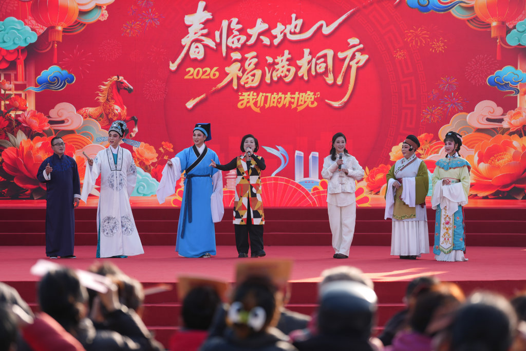 2月2日,浙江省桐庐县2026“我们的村晚”群众文艺联欢会在桐庐县中心广场举行,歌舞、越剧选段、非遗创演秀等群众节目在舞台上演。