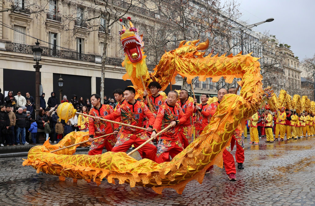 2月1日,在法国首都巴黎的香榭丽舍大街,人们在巡游活动上表演舞龙。