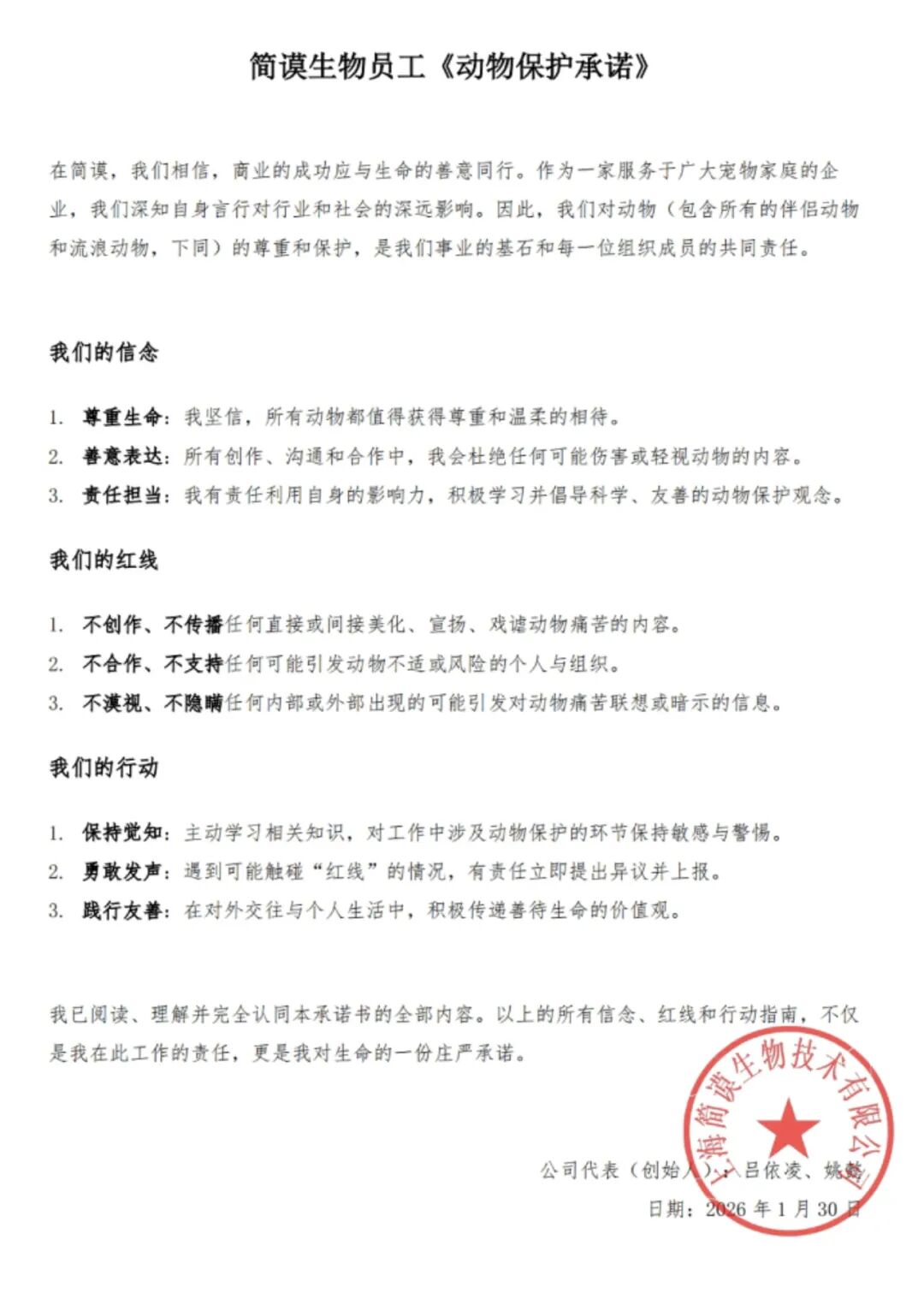 诚实一口同时发布《动物保护承诺》,承诺声明显示,品牌方不创作、不传播任何直接或间接美化、宣扬、戏谑动物痛苦的内容等。