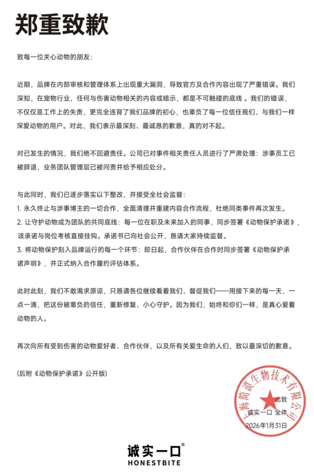 1月31日,诚实一口发布致歉声明表示,公司已对事件相关责任人员严肃处理,并永久终止与涉事博主的一切合作。
