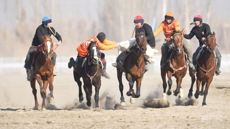 在麦盖提县,首届“刀郎杯”全疆刁羊赛马争霸赛的赛场上,骑手们闻令而动,尽显精湛马背技艺 (央广网发 吾斯曼·麦麦提 摄)