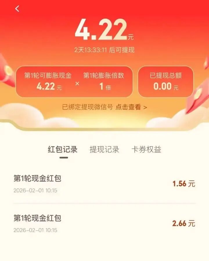 昨天上午,媒体也去抢了元宝10亿红包,一共5次抽奖机会,其中两次分别抢到了2.66元和1.56元现金红包,另外就是抽到了“马年大吉”和“万事胜意”两个马年祝福。页面显示:现金部分可以在2天之后提现。