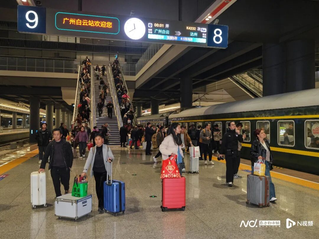 今天00:01,广州首趟春运列车K4232次缓缓驶离广州白云站,开往四川达州,2026年春运正式拉开序幕。本次首趟春运列车共承载旅客1259人,沿途将经过怀化、黔江、重庆等多个站点,全程25小时,预计在2月3日1:55顺利抵达四川达州。
