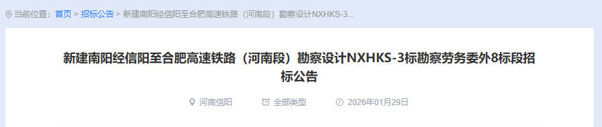 1月29日,新建南阳经信阳至合肥高速铁路(河南段)勘察设计NXHKS-3标勘察劳务委外1~9标段招标公告发布,合计招标金额约3646万元,工期约2个月,标志着南信合高铁勘察设计3标段正式进入初步设计定测阶段。