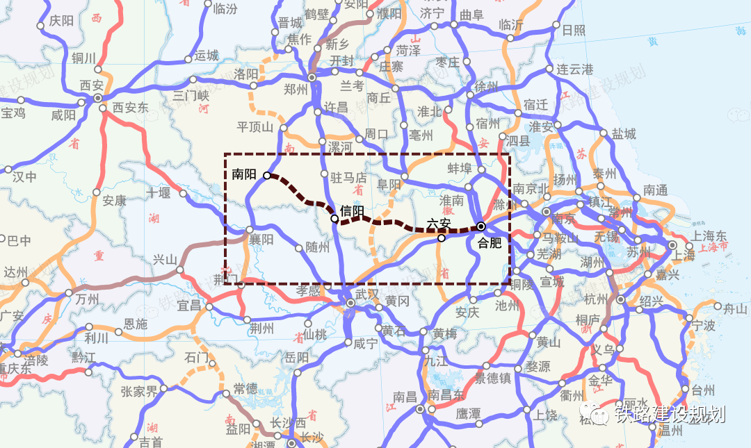 根据可研方案,线路起自郑渝高铁南阳东站,经京广高铁信阳东站、阜黄高铁潢川南站接入在建合武高铁金寨东站。同步建设金寨东站至合武铁路独山站连接线沟通既有合武铁路和在建六庆高铁。
