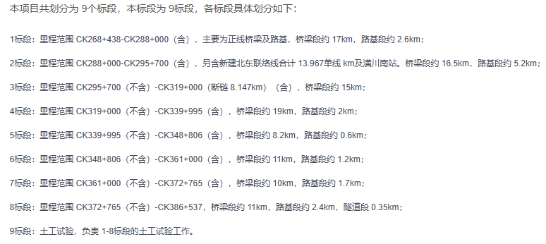 “新建南阳经信阳至合肥高速铁路(河南段)范围包括息县(不含)至豫皖省界,里程范围CK268+438~CK386+537,正线长度约109.952km。