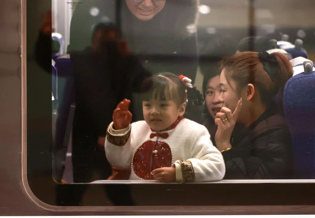 2月2日凌晨5时15分许,上海虹桥站,一名女孩在G4021次列车上朝车窗外挥手。