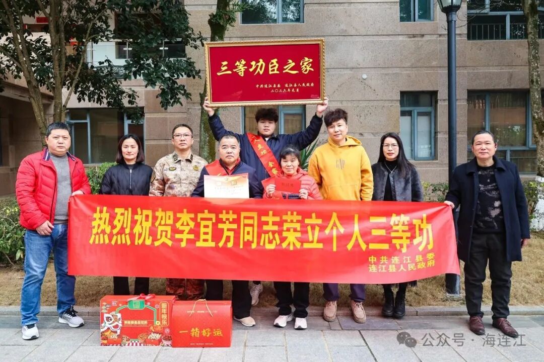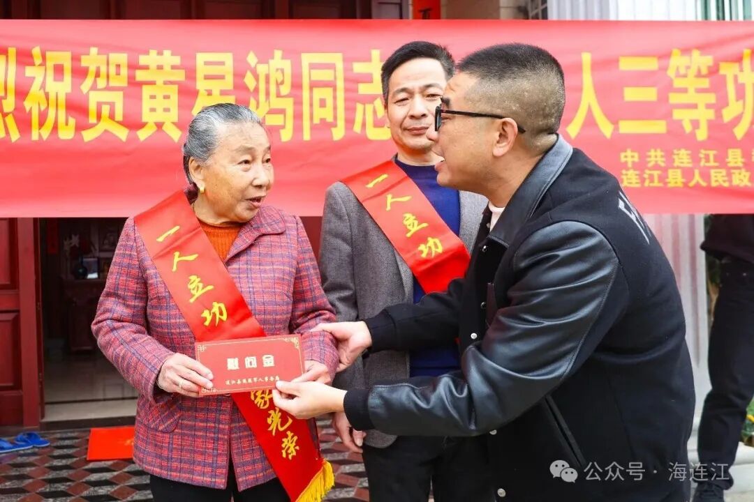 送喜报现场,锣鼓喧天,邻里纷纷簇拥,共同见证这份荣耀。工作人员将喜报、荣誉牌匾与慰问金递到军属手中,并为其披上“一人立功,全家光荣”的鲜红绶带。军属们手捧喜报,喜悦自豪之情溢于言表。