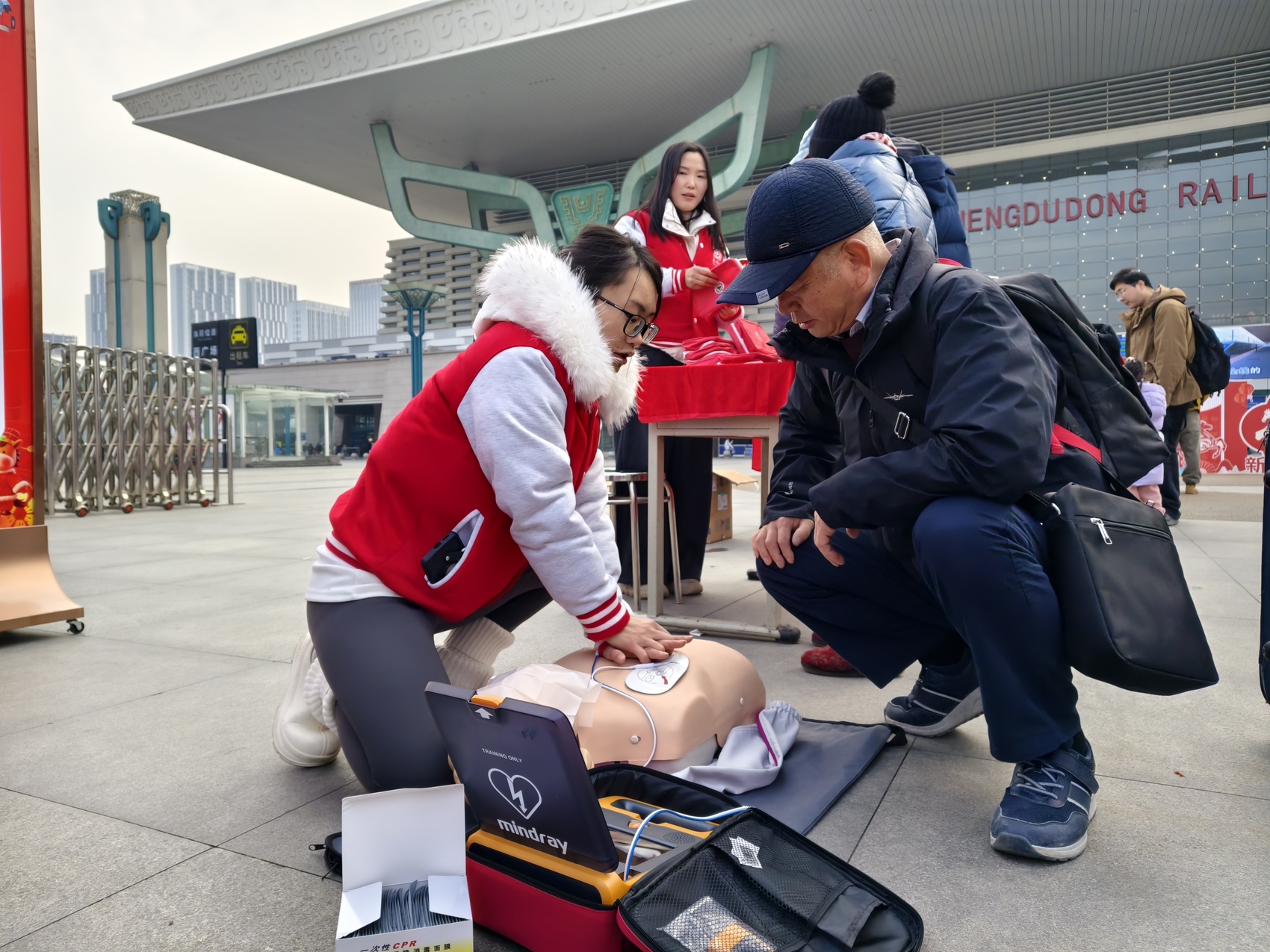 旅客在成都东站前学习AED(自动体外除颤器)使用方法。(白华宇摄)