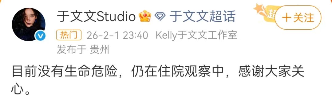 当晚,于文文工作室发文报平安,于文文没有生命危险,仍在住院观察中。