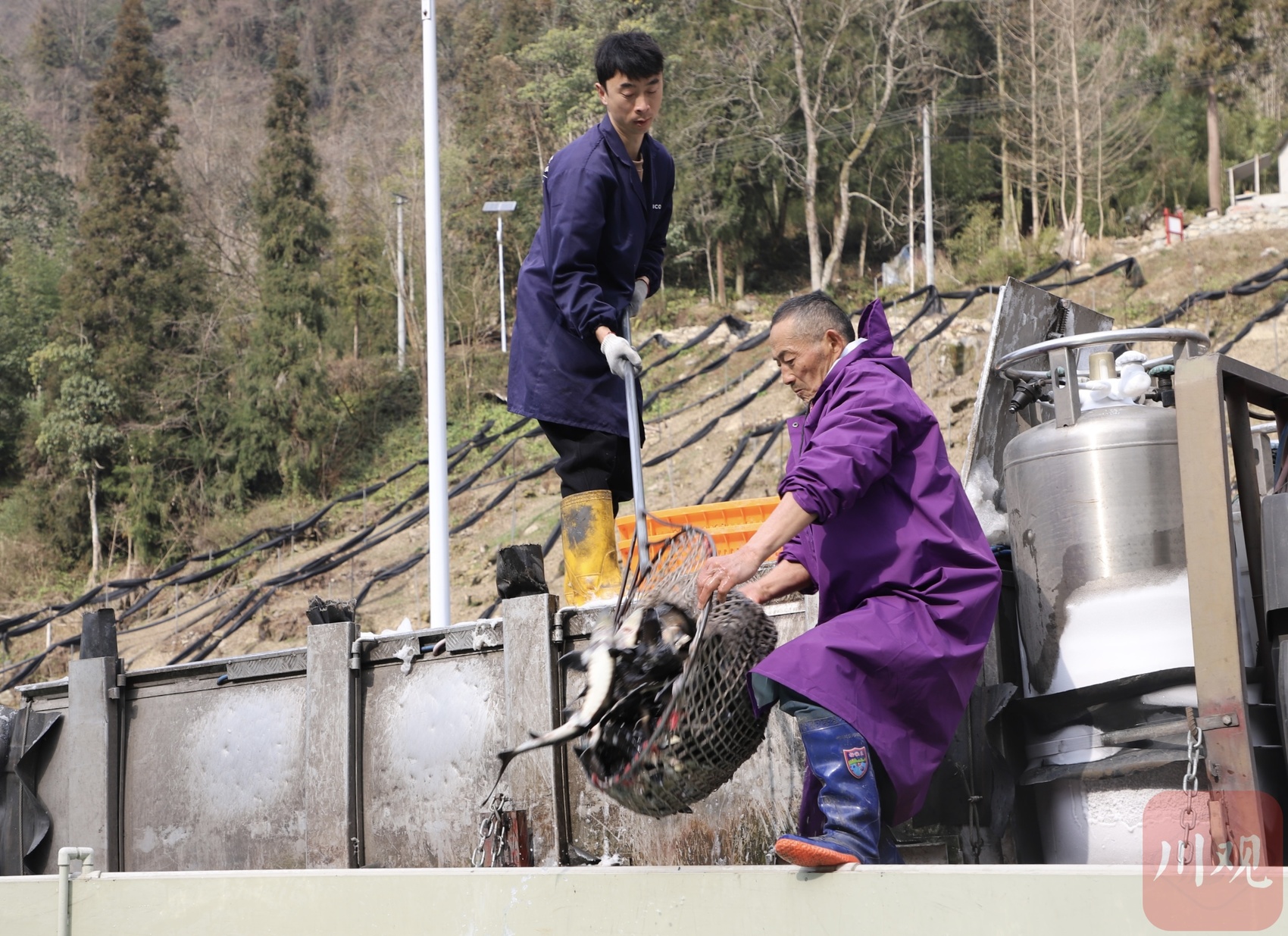 2月2日,汶川县三江镇静居村的山泉水经管道流入河畔的鱼池,工作人员把“远道而来”的鱼苗小心地倒入池中。“这8000斤鱼苗全是从邛崃转运过来的鲟鱼。”静居村党支部书记徐敏说。