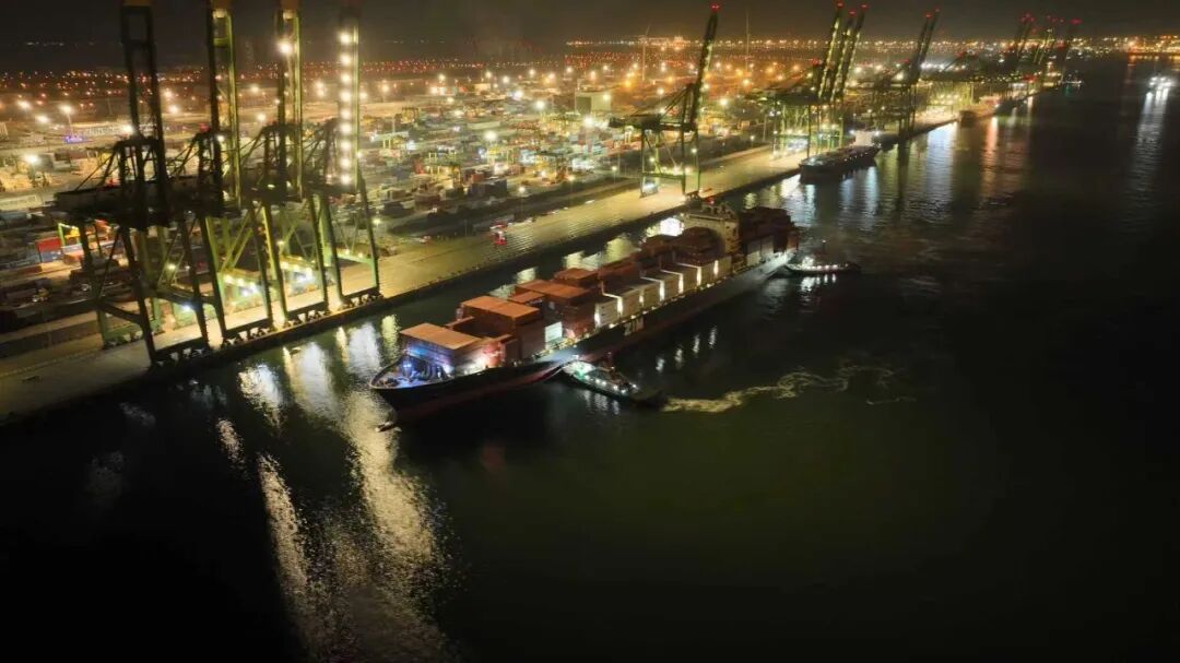 当日23时,船舶精准靠泊,装卸作业随即启动。桥吊巨臂划破夜空,一个个装有车厘子的冷藏集装箱被平稳卸下。