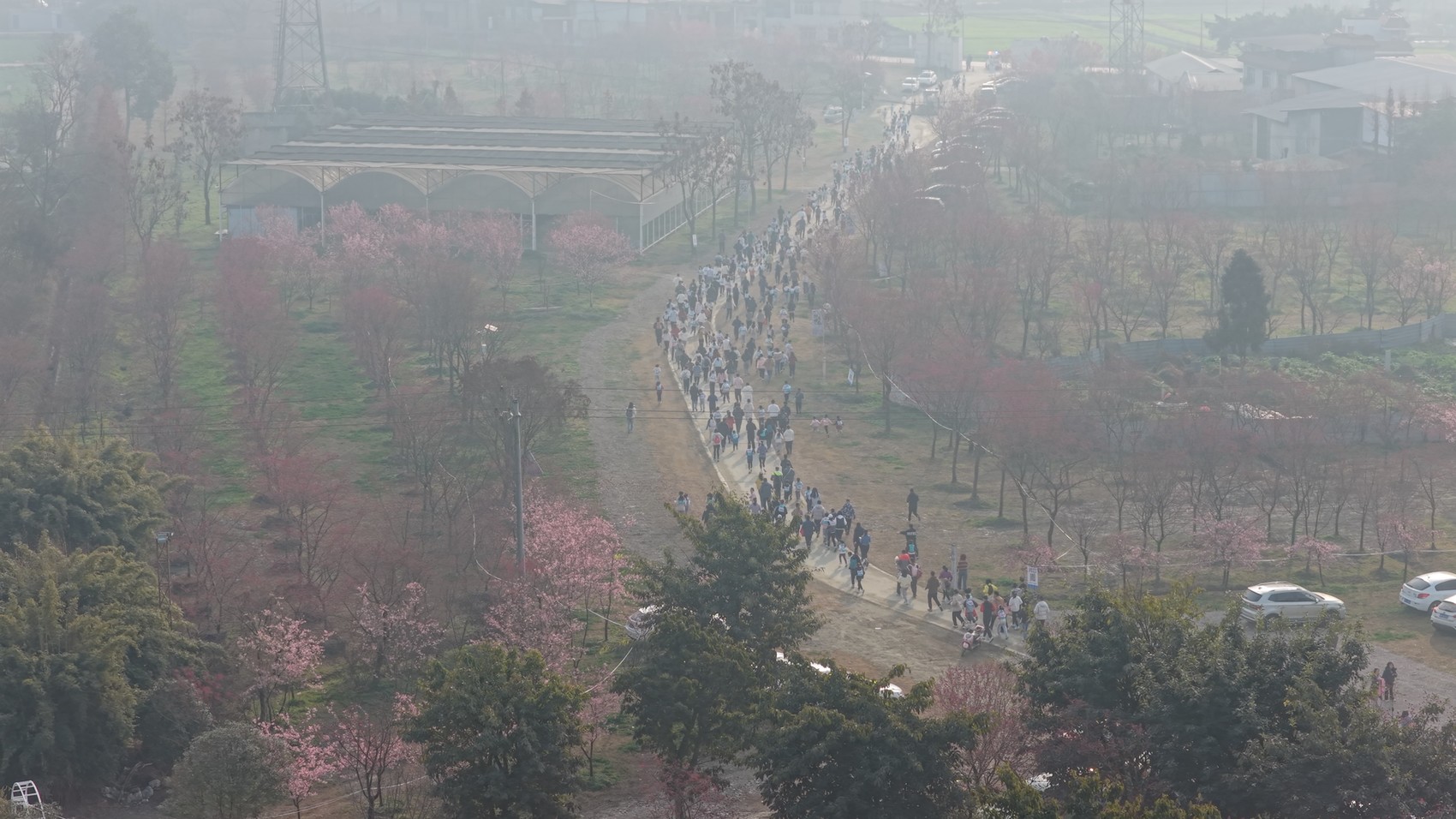 起点所在的绛樱院,因绚烂的早樱开放,最近频频亮相各大媒体。这里栽种着本土培育的“秦樱”等50多个樱花品种,300亩樱花覆盖不同花期,成为一片粉云交融的天然舞台。参与者从樱花林中出发,途经乡村民宿、田野景观与清新村落,在奔跑中沉浸式感受田园之美。
