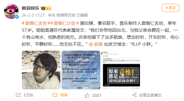 2月2日,据媒体报道,著名歌手、音乐制作人袁惟仁去世,享年57岁。