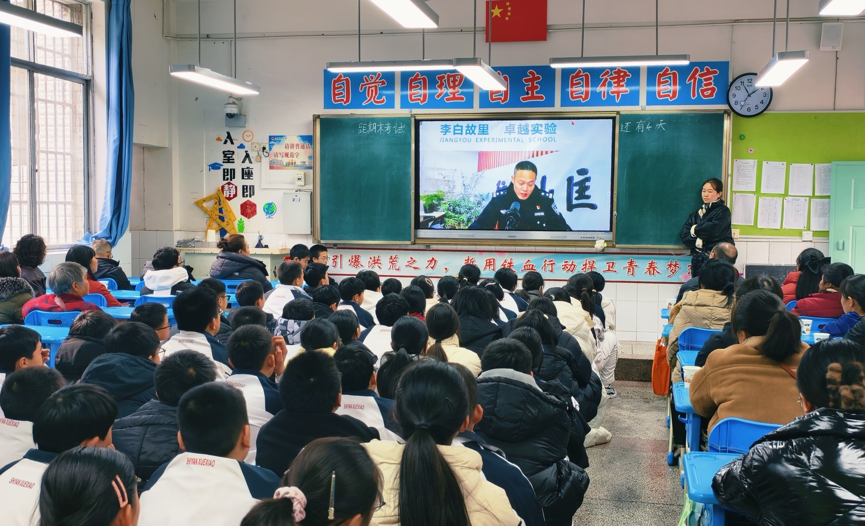 “故意给同学起侮辱性的外号就是一种欺凌,同时我也知道了年龄不是‘保护伞’,更明白了哪些事情绝对不能做。”1月23日下午,随着该校期末考试结束的铃声响起,初二年级的梁小小(化名)并没有立刻离开教室,和他一样,全校约3000名同学正通过一场25分钟的“音画直播”与法治副校长进行一次“云端”对话。这并非一次孤立的讲座,而是江油全市52所中小学7万多名同学在期末“法治和心理健康教育周”上的“同一课”。从秋季学期开始,江油市将每个学期开学第一周和期末前最后一周设为“法治与心理健康教育周”,这样的法治教育都会如期举行。