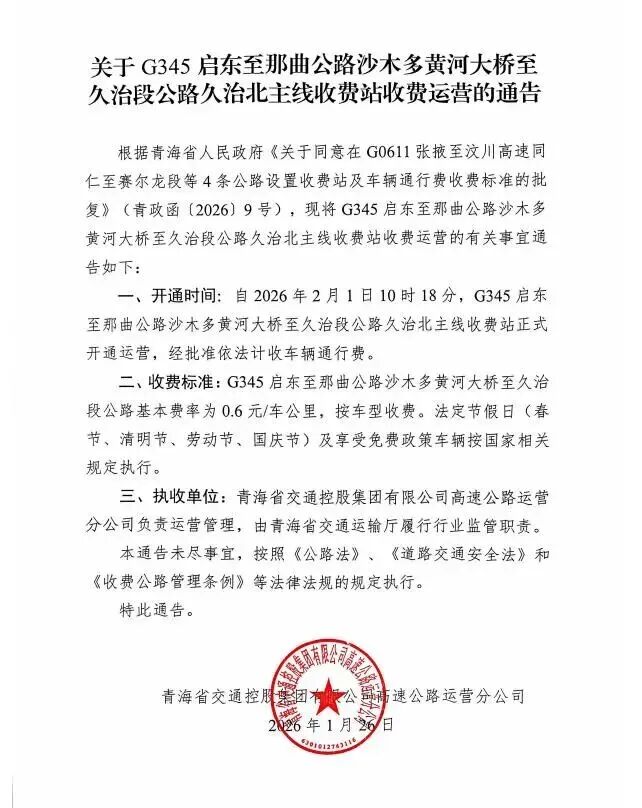 2月1日10时18分,根据青海省人民政府《关于同意在G0611张掖至汶川高速同仁至赛尔龙段等4条公路设置收费站及车辆通行费收费标准的批复》(青政函〔2026〕9号),G345启东至那曲公路沙木多黄河大桥至久治段公路久治北主线收费站正式开通运营。