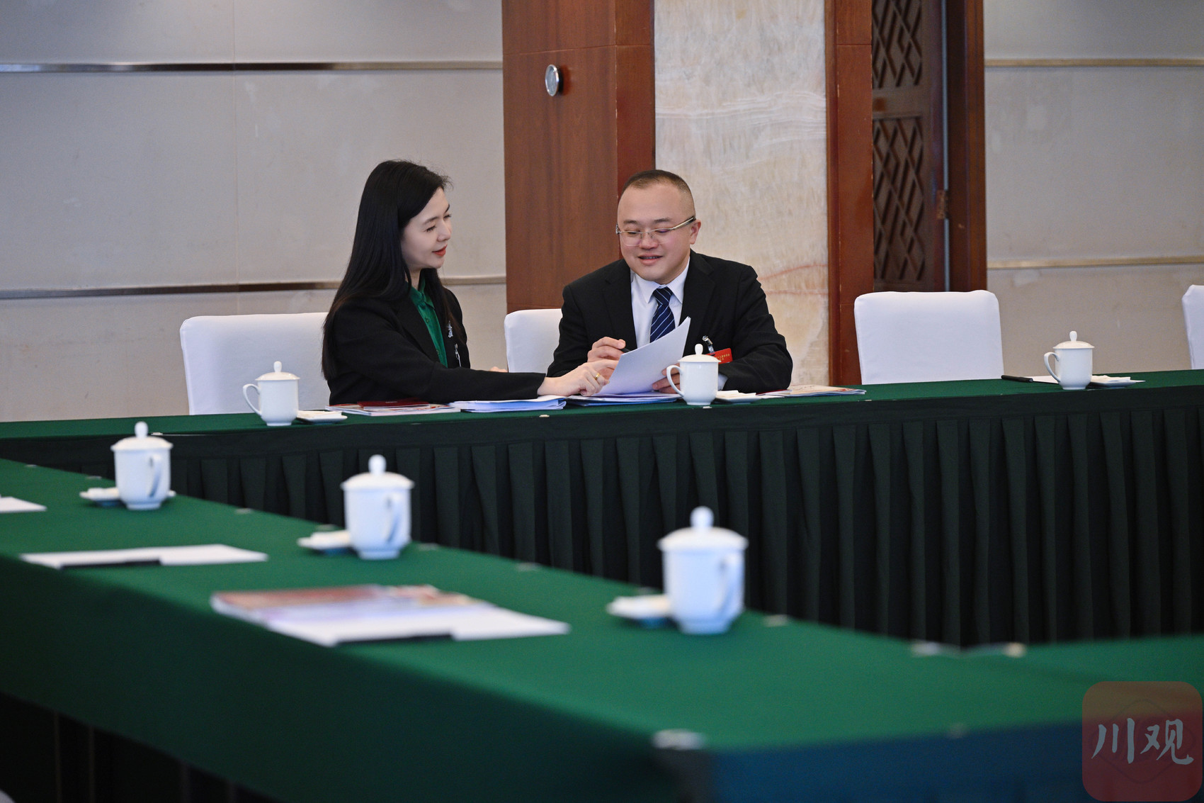 2月3日,黄艺竹委员(左)和伍亮吉委员(右)在会议室交流讨论建议内容。