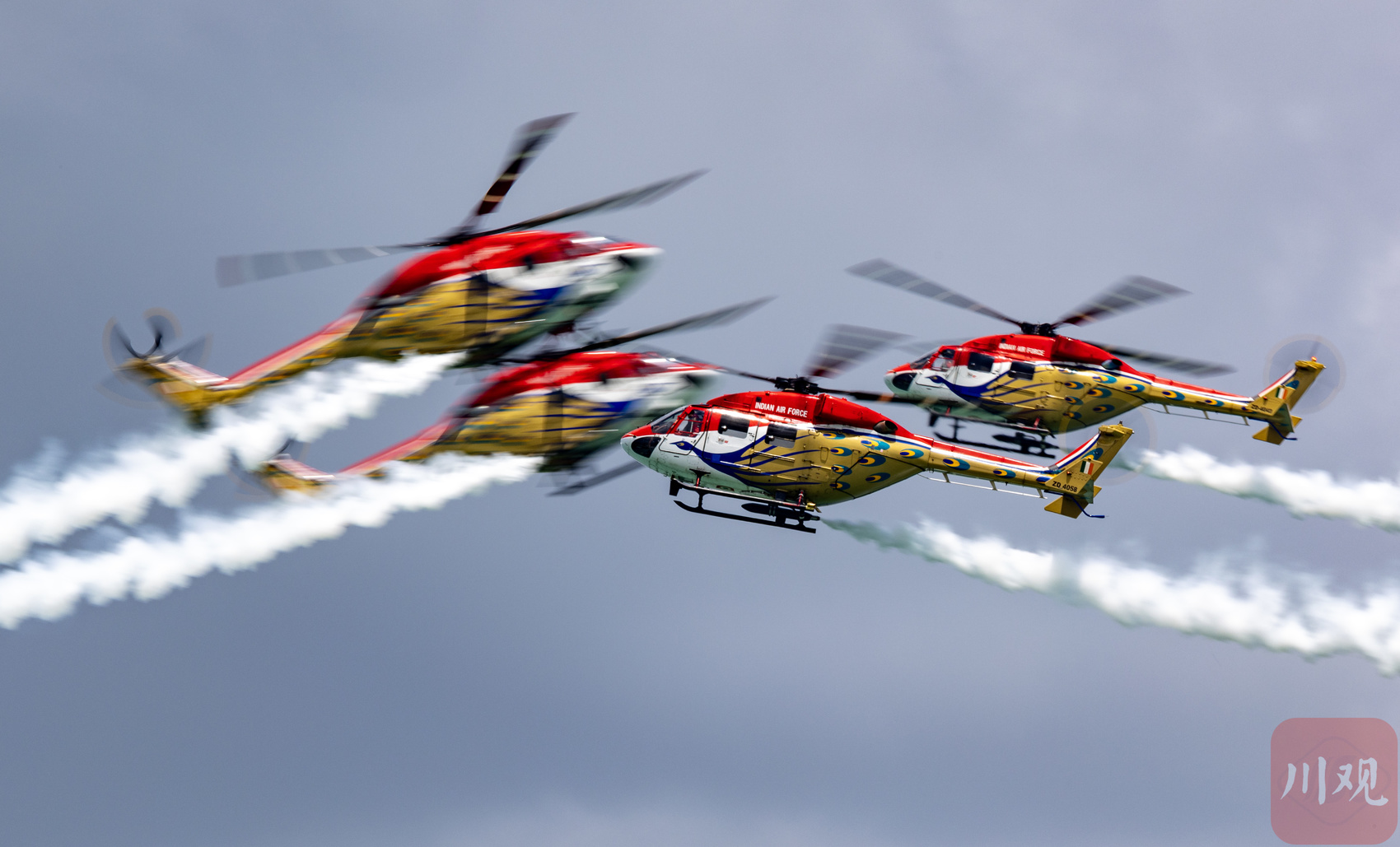 2月3日,印度空军孔雀飞行表演队在进行四机对冲表演。
