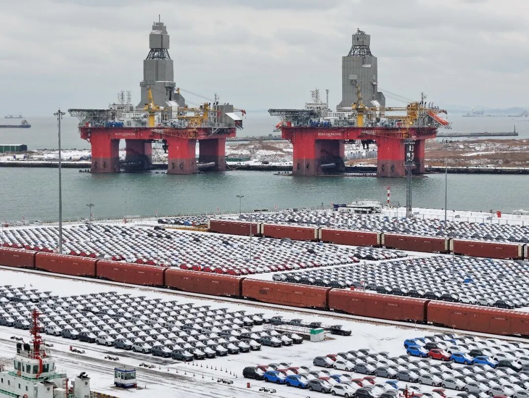 2026年1月18日,在山东港口烟台港拍摄的出口汽车和半潜式钻井平台。(唐克/人民视觉)