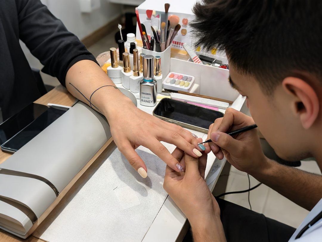▲男员工试色新款甲油胶产品。 Zoe|摄