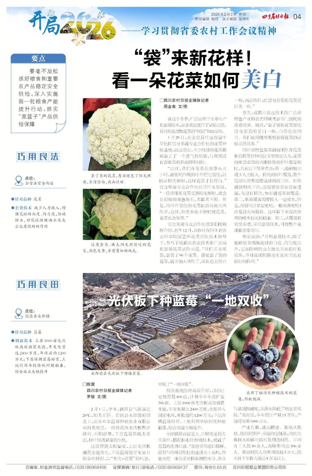 花菜也要“美白”?套袋技术让它又白又整齐!光伏板下种蓝莓,一块地挣两份钱,农业也能这么“科技感”。