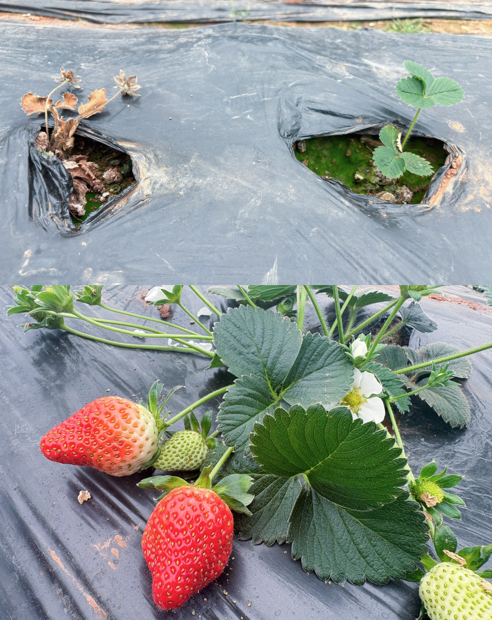 此前生长停滞的草莓苗(上)和现在的草莓苗(下)对比。