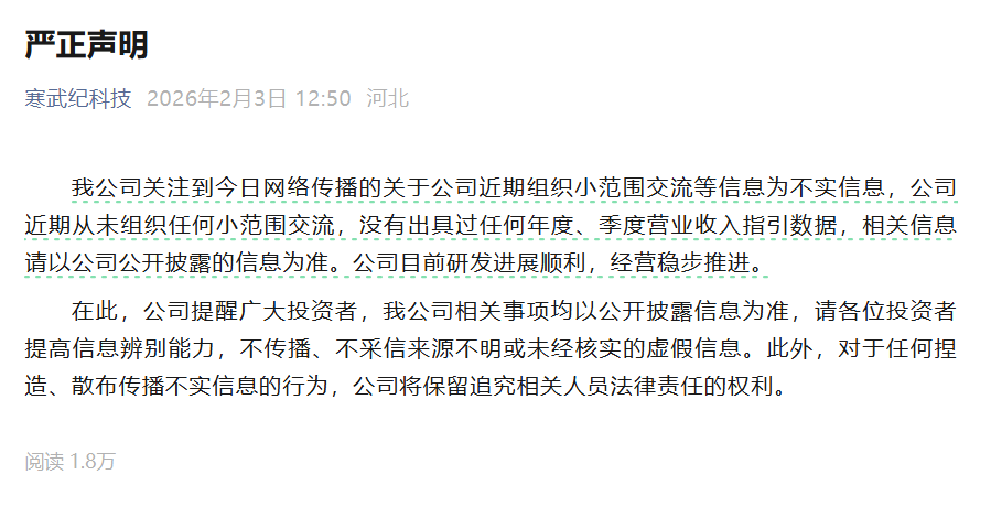 我公司关注到今日网络传播的关于公司近期组织小范围交流等信息为不实信息,公司近期从未组织任何小范围交流,没有出具过任何年度、季度营业收入指引数据,相关信息请以公司公开披露的信息为准。公司目前研发进展顺利,经营稳步推进。