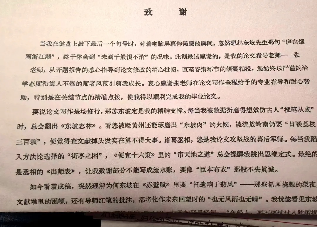 这封信,是一篇论文致谢词。她写道“要说论文写作是场修行,那苏东坡定是我的精神支撑。”她感谢东坡,感谢自己的父母和姐姐,感谢父母在她想去新疆实习的时候也尊重自己的意见;感谢姐姐带领自己走入了诗歌的国度。