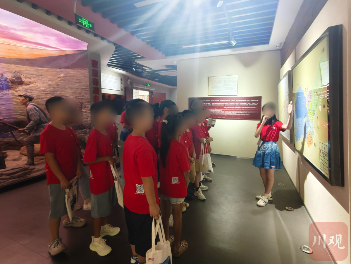 在红军纪念馆,9岁的小侨穿着整洁的讲解员制服,正为小游客讲述红军长征在天全的故事。