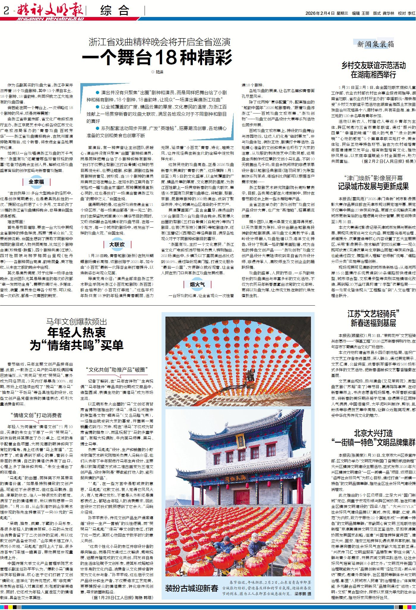 今日版面“早”知道:1版头条《两会说文明》栏目,看江苏、四川、上海的3位代表委员关注了哪些民生话题;倒头条《新春走基层》栏目,带你探访湖南小山村的村晚,感受乡土文化的鲜活表达;《热点观察》栏目聚焦邀约“互联网熟人”看春晚彩排的礼遇举措与“非遗证书”明码标价的争议话题。2版头条探寻如何以一台戏唱遍浙江戏曲的万千气象,“浙里有戏”还藏着哪些好看好玩的惊喜。3版“深读”关注全民阅读立法,看互联网时代如何共绘全民阅读的未来新图景。