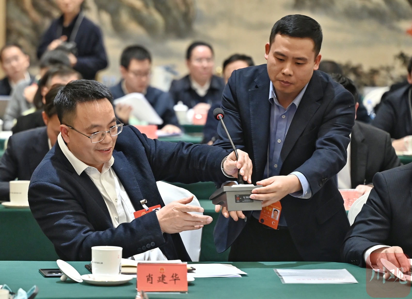 在审议政府工作报告时,肖建华代表(左)踊跃发言。