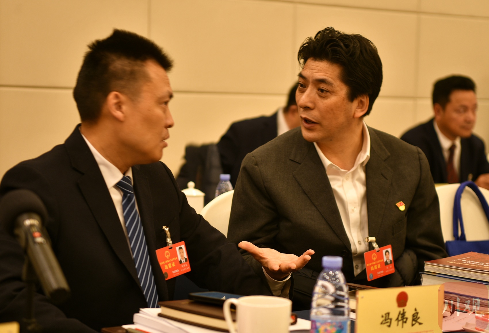 省人大代表刘洪(右)与冯伟良(左)热议政府工作报告。
