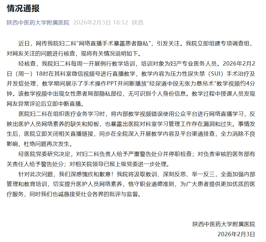 经核查,我院妇二科每周一开展例行教学培训,培训对象为妇产专业医务人员。2026年2月2日(周一)18时在其科室微信视频号进行直播教学,教学内容为压力性尿失禁(SUI)手术治疗及并发症处理,教学期间展示了手术操作PPT并间断播放“经尿道中段无张力悬吊术”教学视频约4分钟。该教学视频中出现女性患者局部隐私部位,无可识别个人身份信息。教学过程中授课人员发现网友异常评论后立即中断直播。