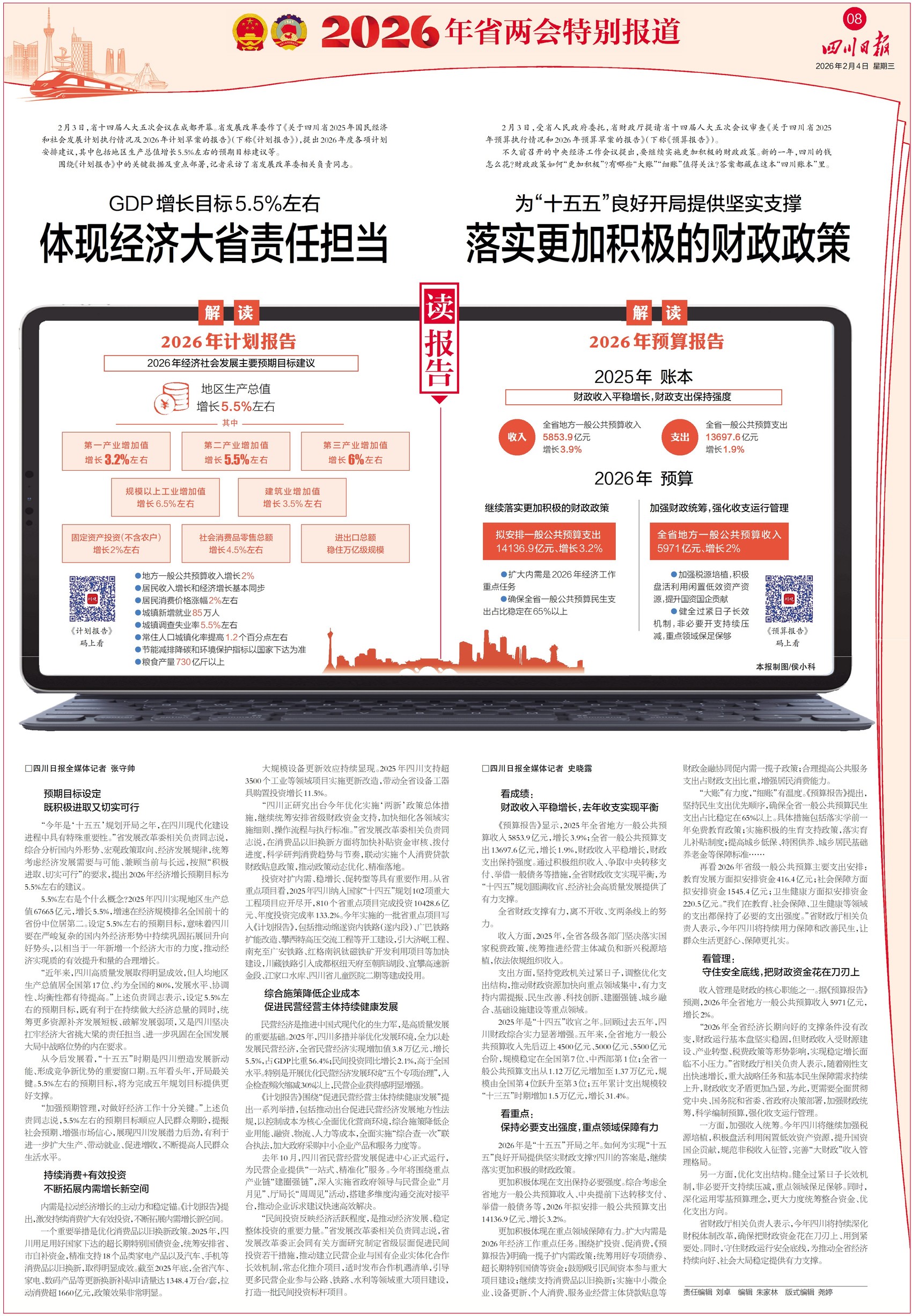 八版为你解读预算报告和计划报告。去年四川的账本情况如何,今年四川将把钱花在哪些领域,有哪些“大账”“细账”值得一说,2026年四川GDP增长目标设为5.5%左右有什么考虑,翻开8版都能找到答案。