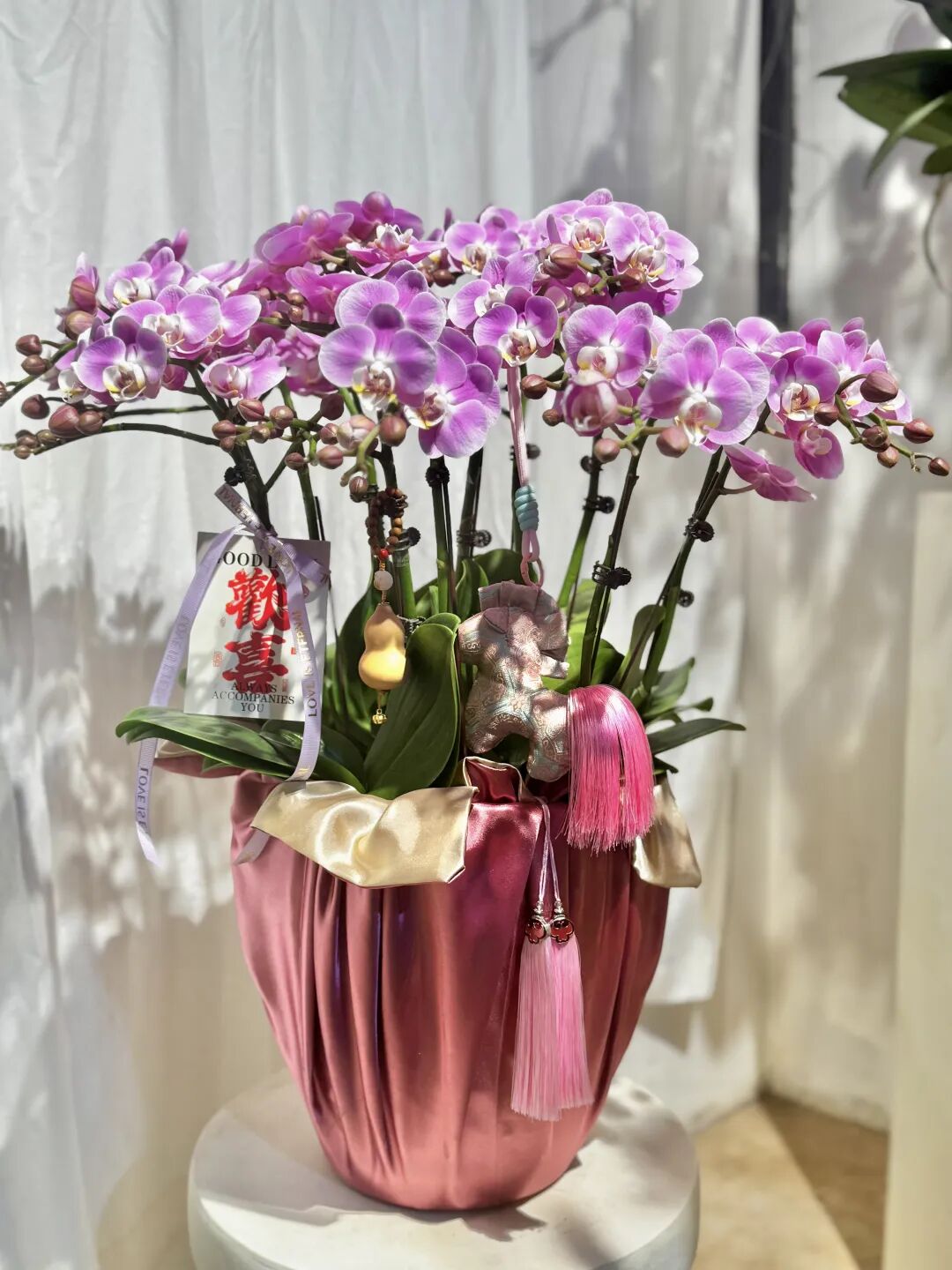 马年将至,店里还特别推出了马年创意年宵花,蝴蝶兰盆栽上点缀了小马挂件、小葫芦配饰,既添年味,又暗含“马上有钱、马到成功”的寓意。