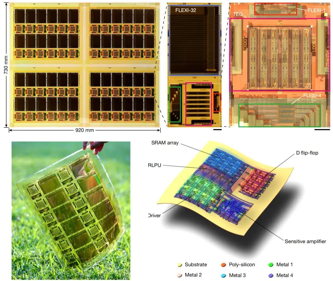 清华大学集成电路学院教授任天令介绍,FLEXI采用模块化、可扩展的数字存算架构,支持稳定、高速、并行的点积运算。实验结果表明,这种基于低温多晶硅薄膜晶体管的柔性芯片,可在2.5至5.5伏电源电压范围内稳定工作,并在半径1毫米、180度弯折条件下经受超过4万次弯折循环而性能无明显退化。同时,FLEXI在长时间高频运算中实现零错误运行,整体良率达70%至92%,并具备良好的长期稳定性。