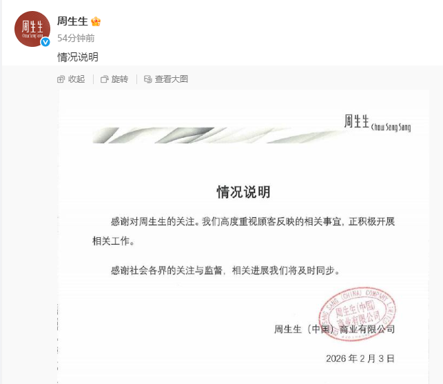 对此,2月3日,周生生官方账号发布情况说明:我们高度重视顾客反映的相关事宜,正积极开展相关工作。