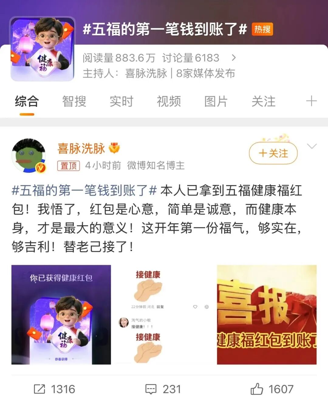 2月3日一早,由于领取“健康福”的网友众多,“健康福”和“五福的第一笔钱到账了”话题,更是冲上了微博热搜。