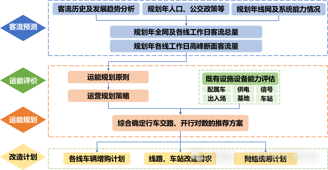 三、首创形成了“需求分析—系统评估—运能规划-改造规划”的全闭环运能提升技术方法体系。串联了客流预测及分析、六大既有设施设备能力评估、地铁和市域线行车交路方案、车辆统筹规划、改造规划运能提升的全过程链,实现运能规划指导改造规划。