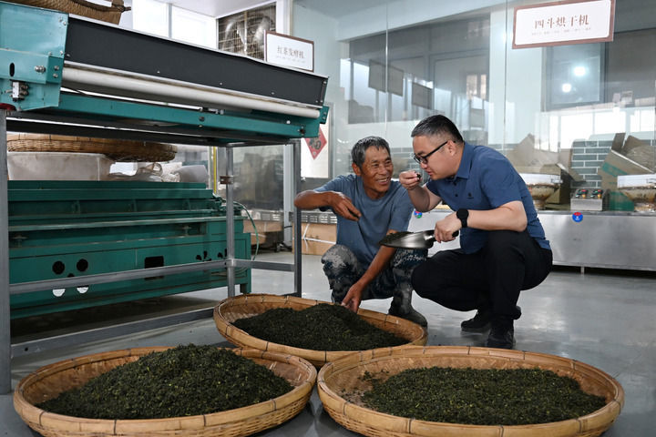 2025年5月25日,在山东省日照市五莲县丁家楼子村,第一书记郑勇山(右)在村里的茶叶合作社查看茶叶品质。新华社记者 马宁 摄