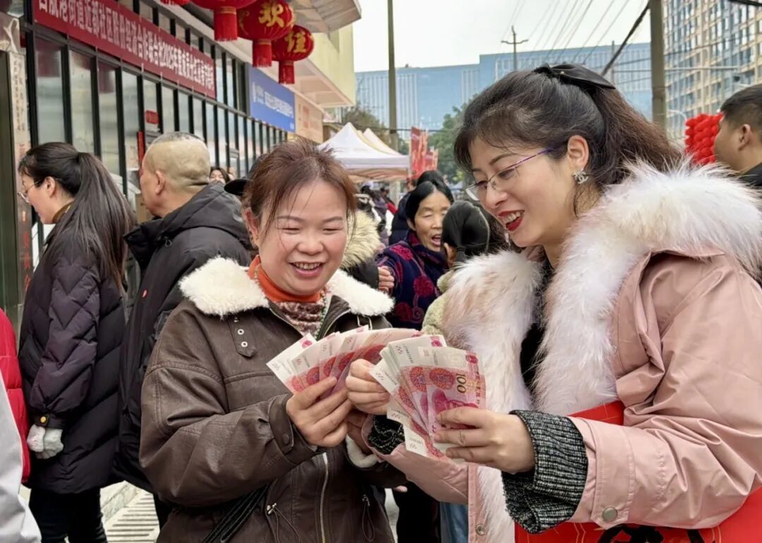 “又到领分红的时候啦!”下午1点,分红现场已人头攒动,厚厚的现金整齐码放,成箱的菜籽油堆成了“小山”,居民们有序排队、签字、领福利,相互分享着喜悦。“每年的这个时候最开心,社区的分红比闹钟还准时!”居民熊淑凤手里攥着刚领到的现金红包笑着说,这笔钱刚好用来添置年货、补贴家用,是社区给居民最实在的新春祝福。